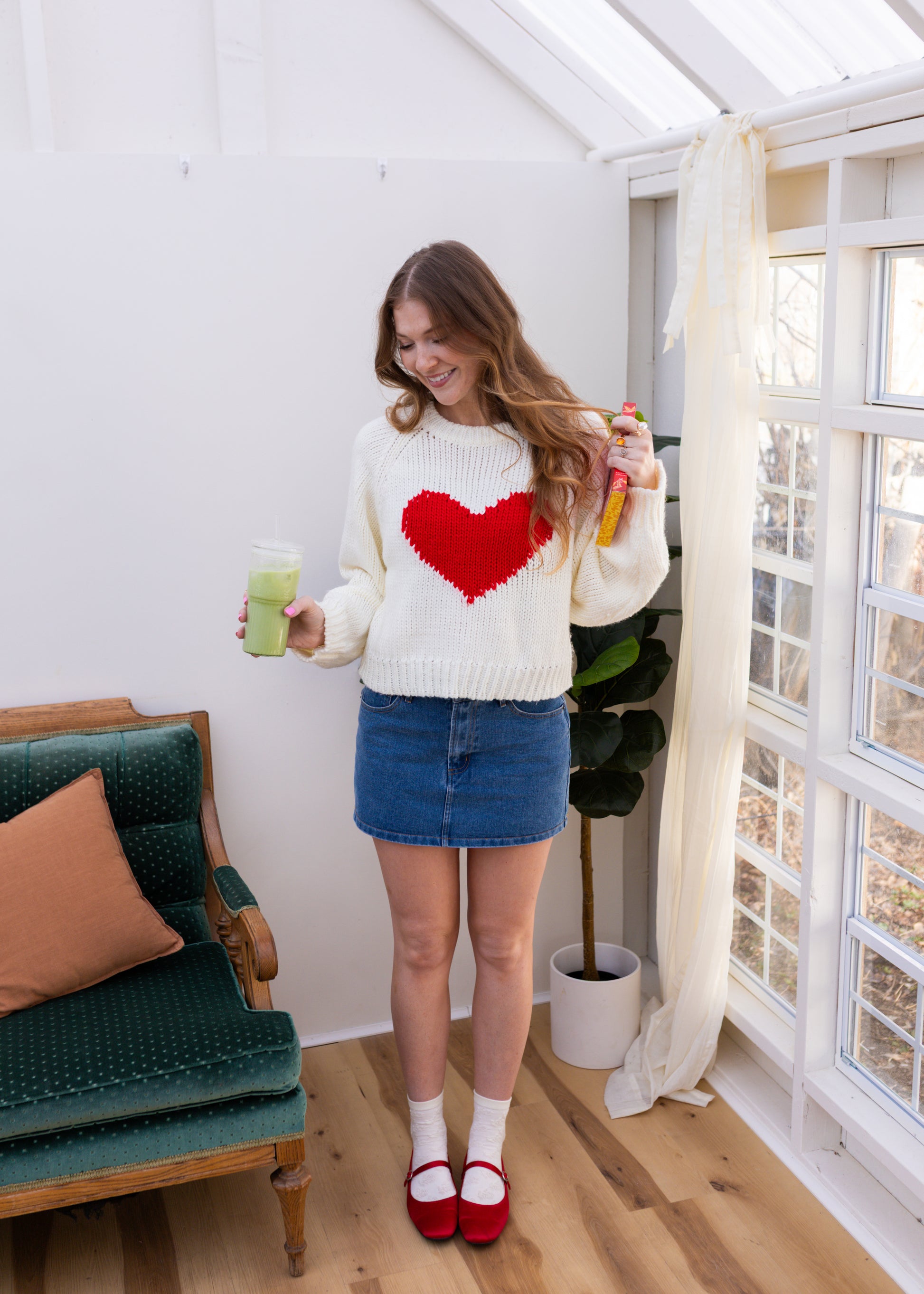 product fits true to size. hallie is 5'8 and wearing a size M. fabric is 100% acrylic with lots of stretch. paired with the free now denim skirt.