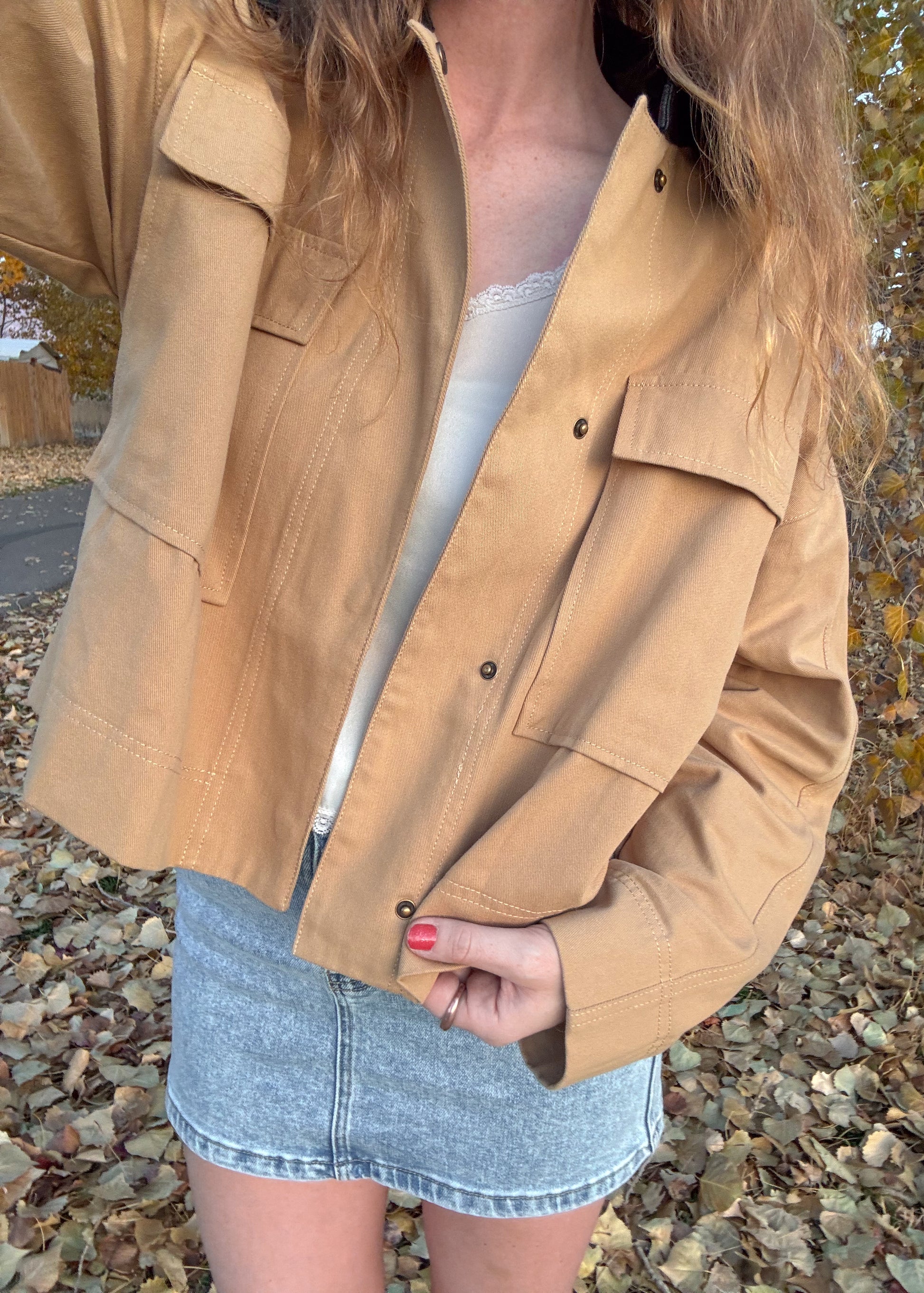 fabric is polyester and cotton with no stretch. paired with the betty lace tank and down bad denim skirt.