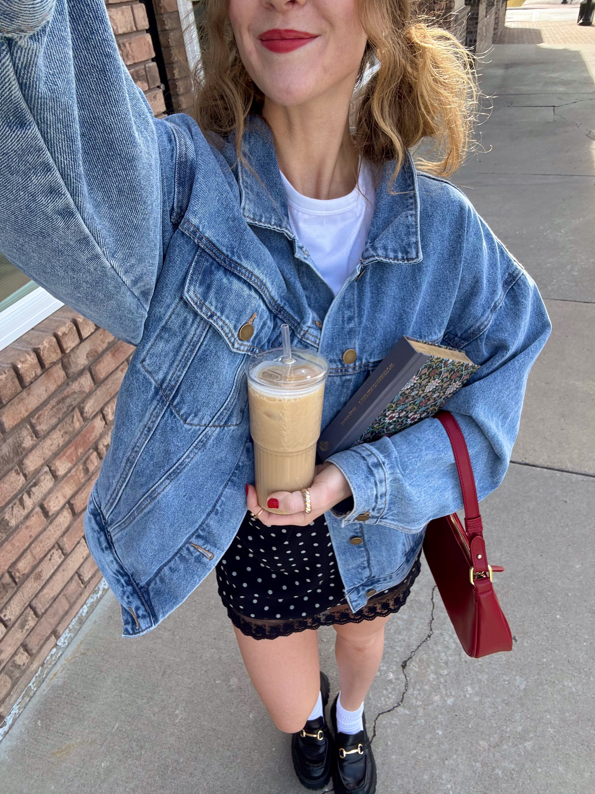 product fits true to size. hallie is 5'8 and wearing a size M. the fabric is polyester with no stretch. paired with the january daze denim jacket.