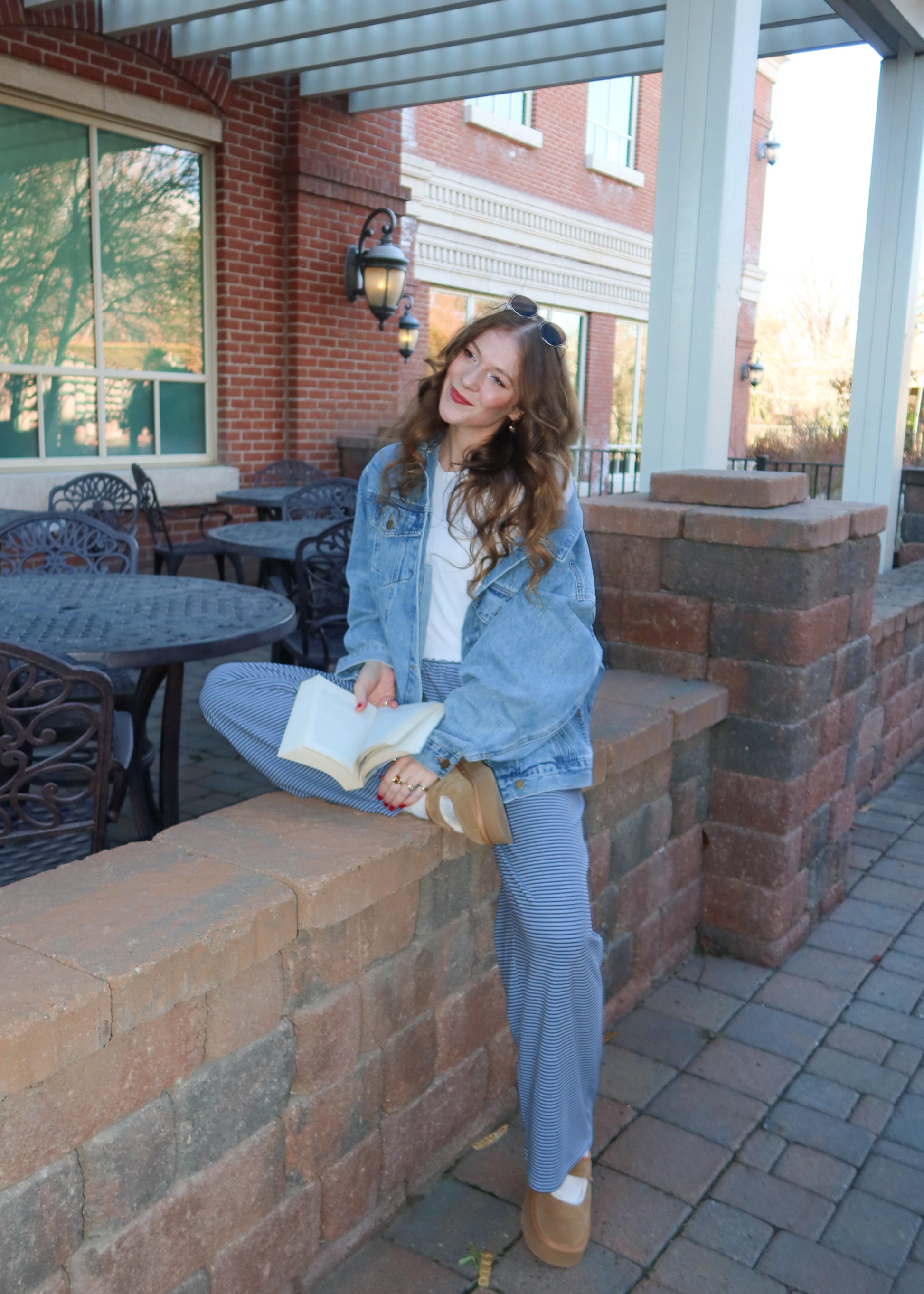 product fits true to size. hallie is 5'8 and wearing a size M. the fabric is polyester and spandex with lots of stretch. paired with the january daze denim jacket.