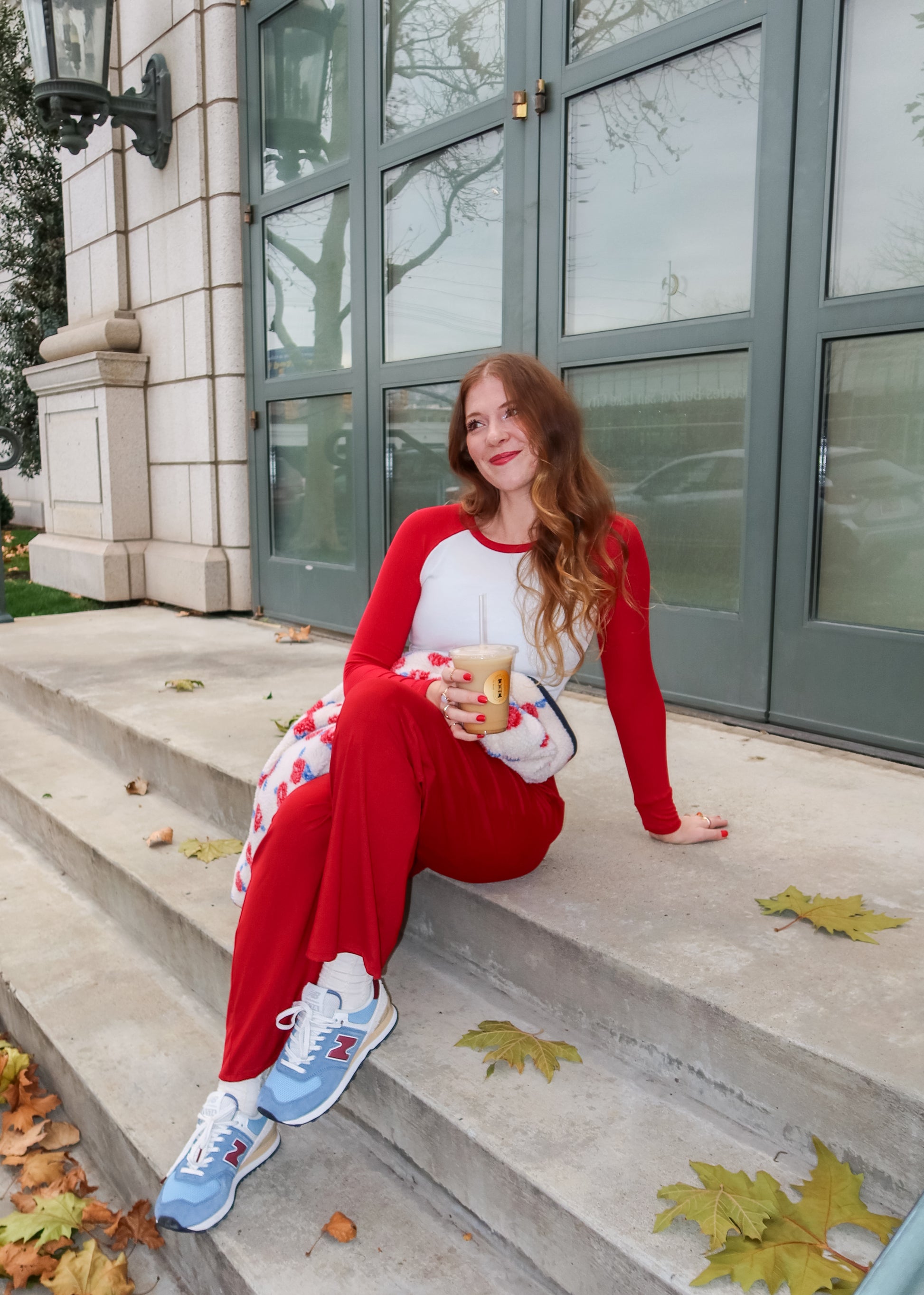 product fits true to size. hallie is 5'8 and wearing a size M. the fabric is polyester and spandex with lots of stretch. paired with the road trip top and rose colored glasses sherpa.